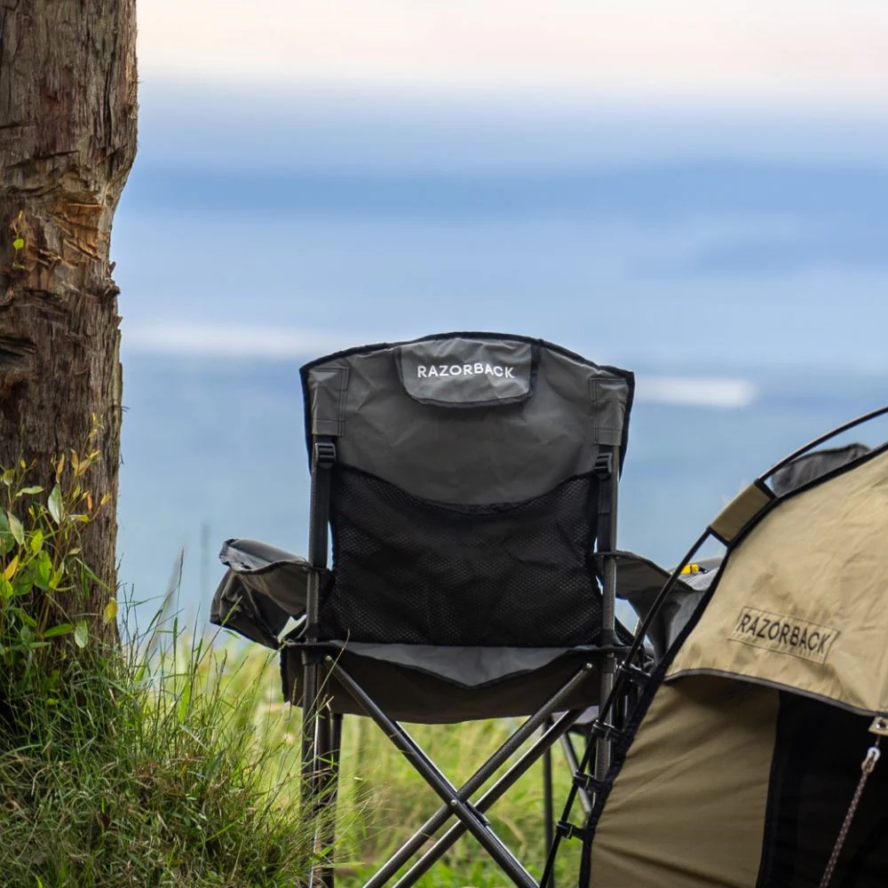 Our Aussie-tough Bush King Camp Chair is crafted from rugged 8oz canvas treated for fire retardancy, UV resistance, and mould prevention. Enjoy the outdoors in comfort with a padded seat and backrest, supported by a robust X-style frame for easy setup and pack-down. The heavy-duty galvanized steel frame, rated to 150kg, ensures stability.